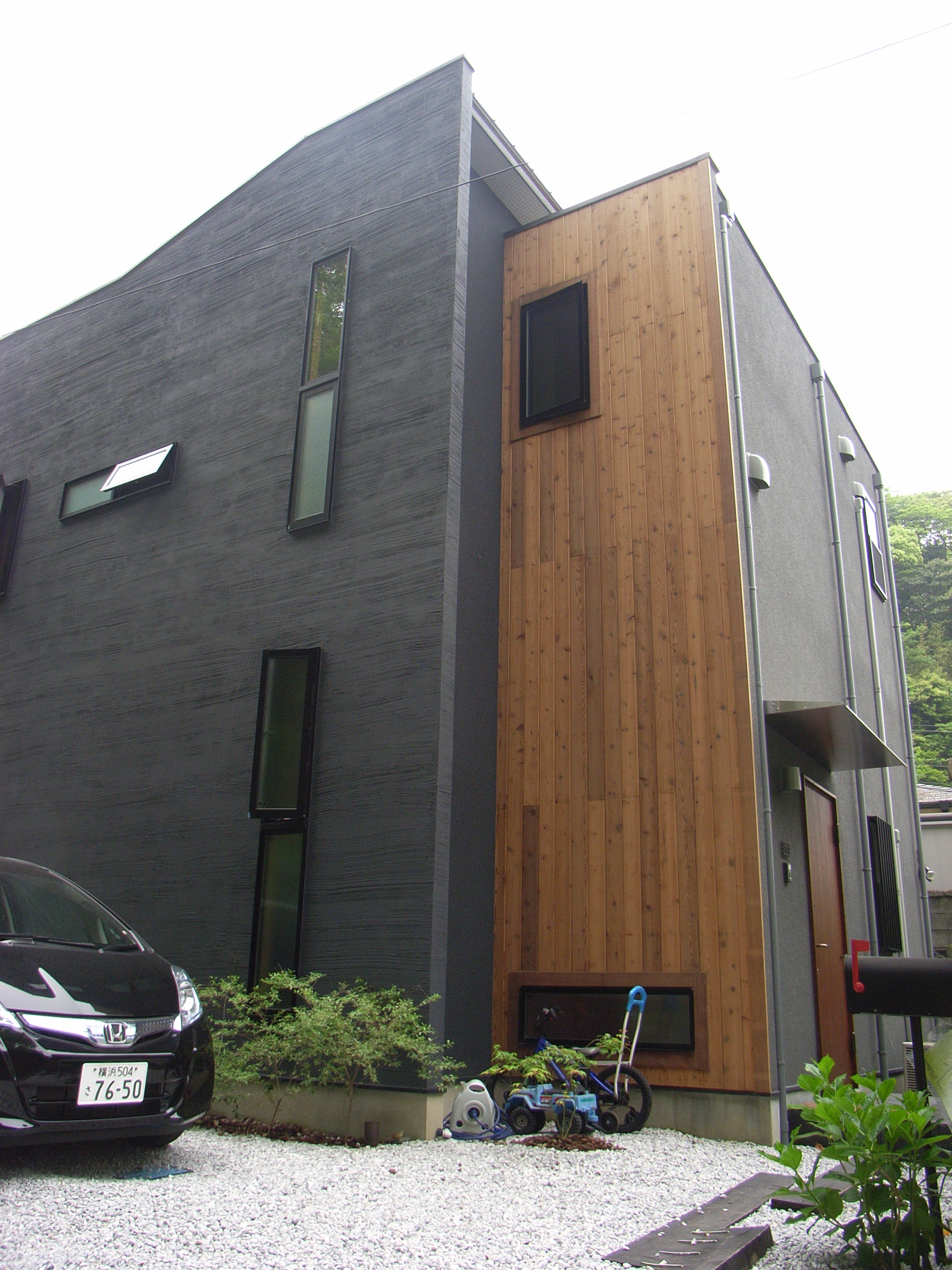 黒の櫛目引きと縦貼りの木製サイディングの家