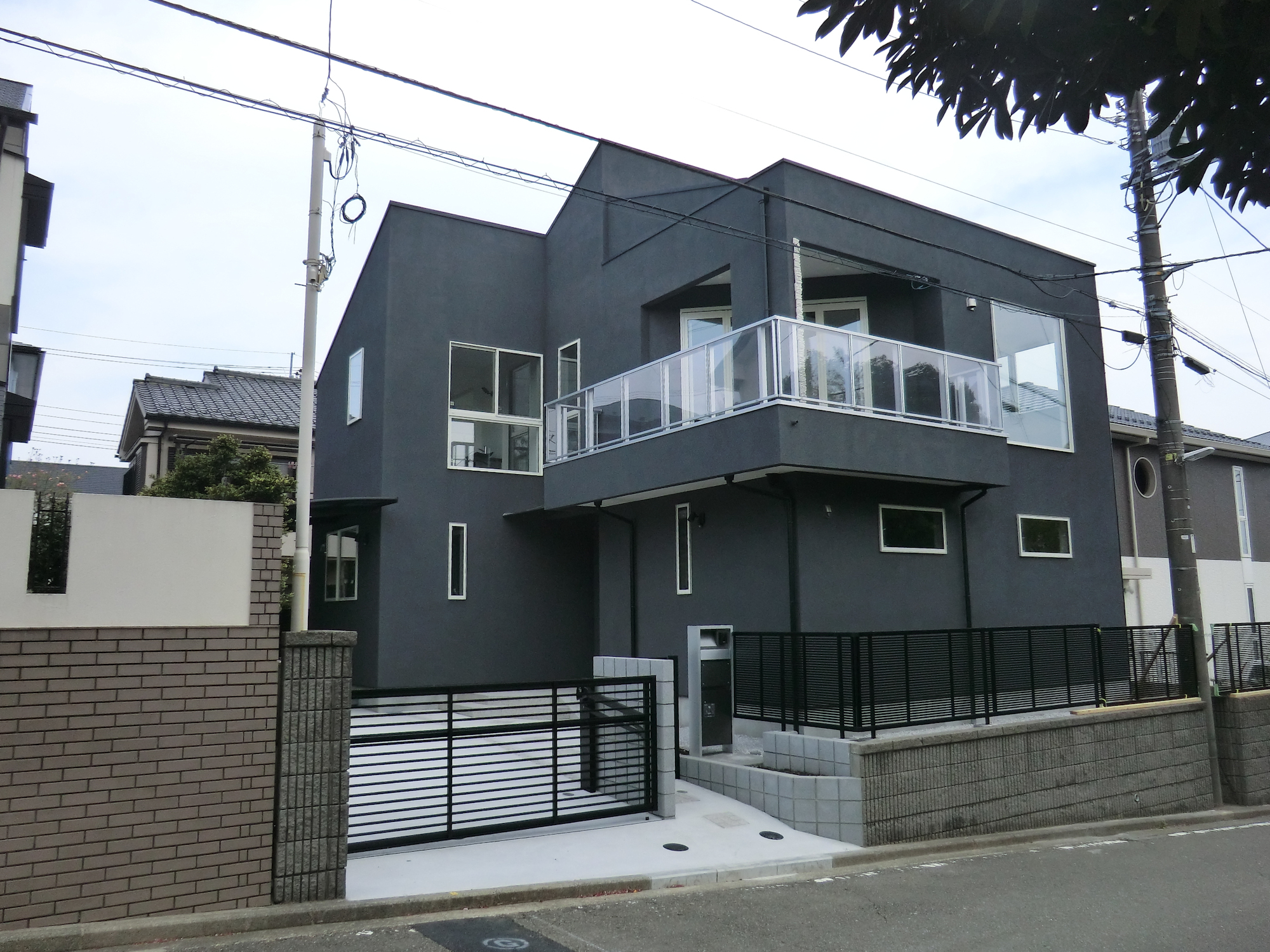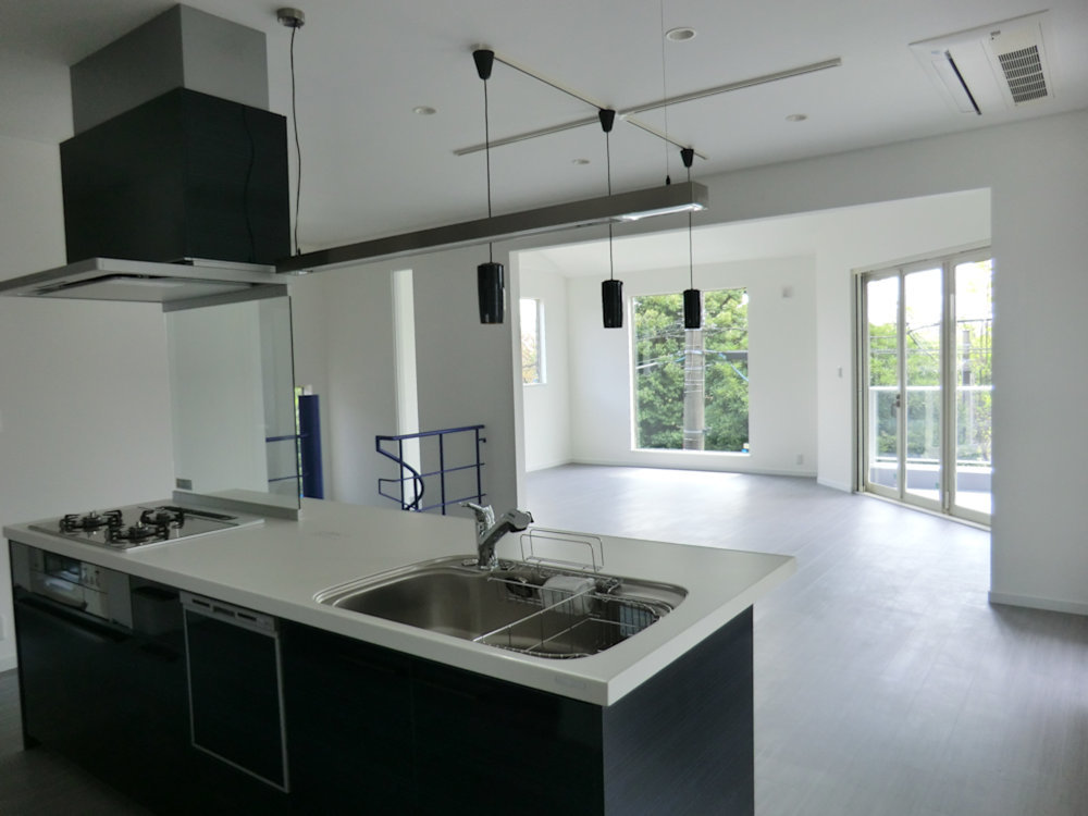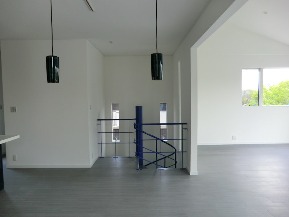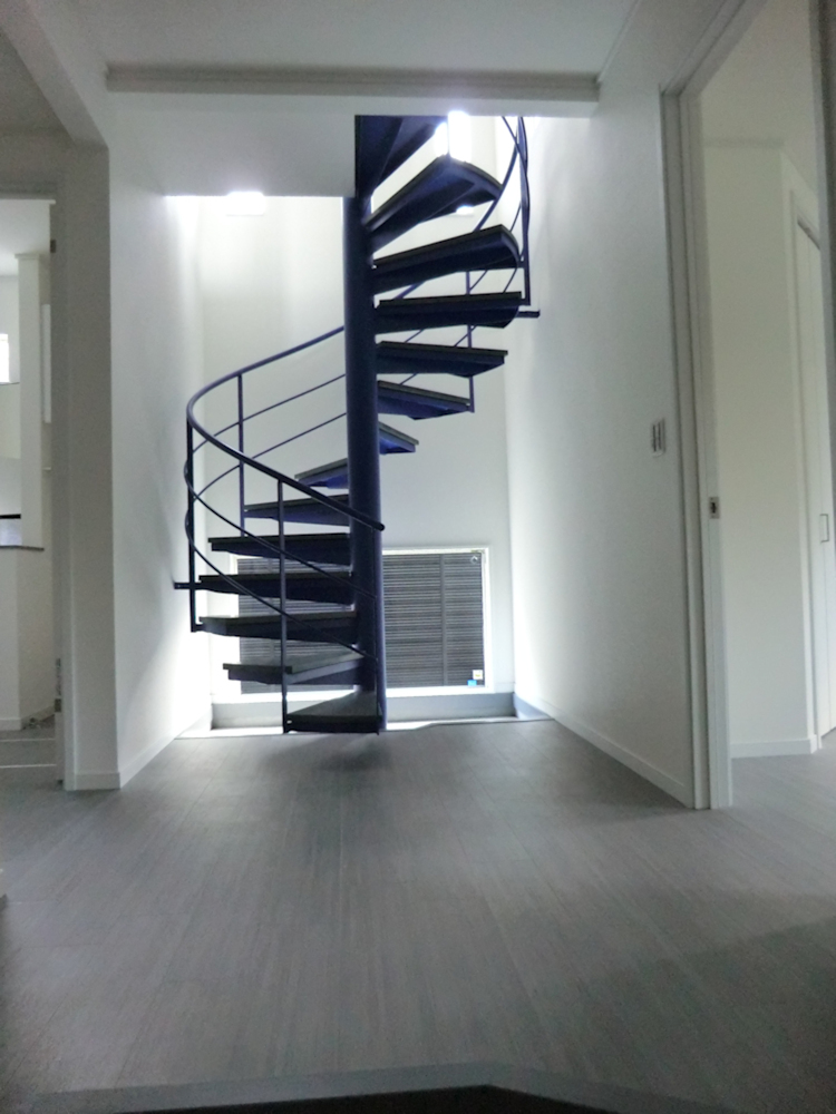 玄関から入ると 2階のリビングまで解放した空間に ブルーの鉄骨螺旋階段が存在感を主張しています。